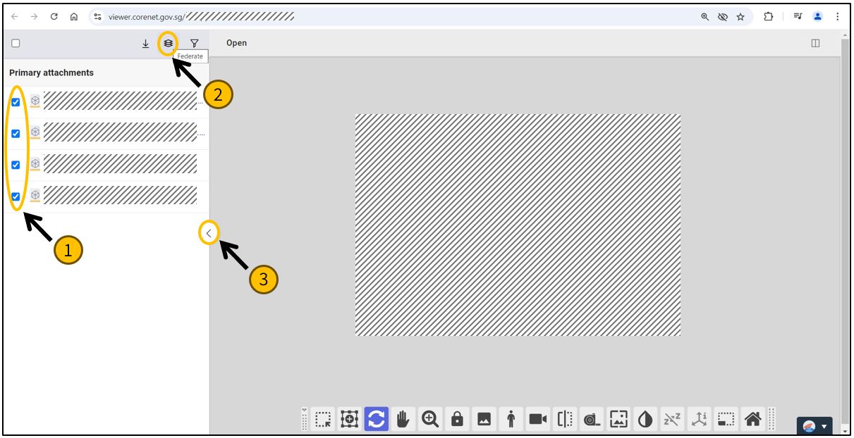Under the “Coordinated BIM” tab in the CORENET X Submission Portal, upload unencrypted BIM files and “preview (your) model” in the Lightweight BIM Viewer. This is a simplified version of the CORENET X Collaboration Platform used by officers