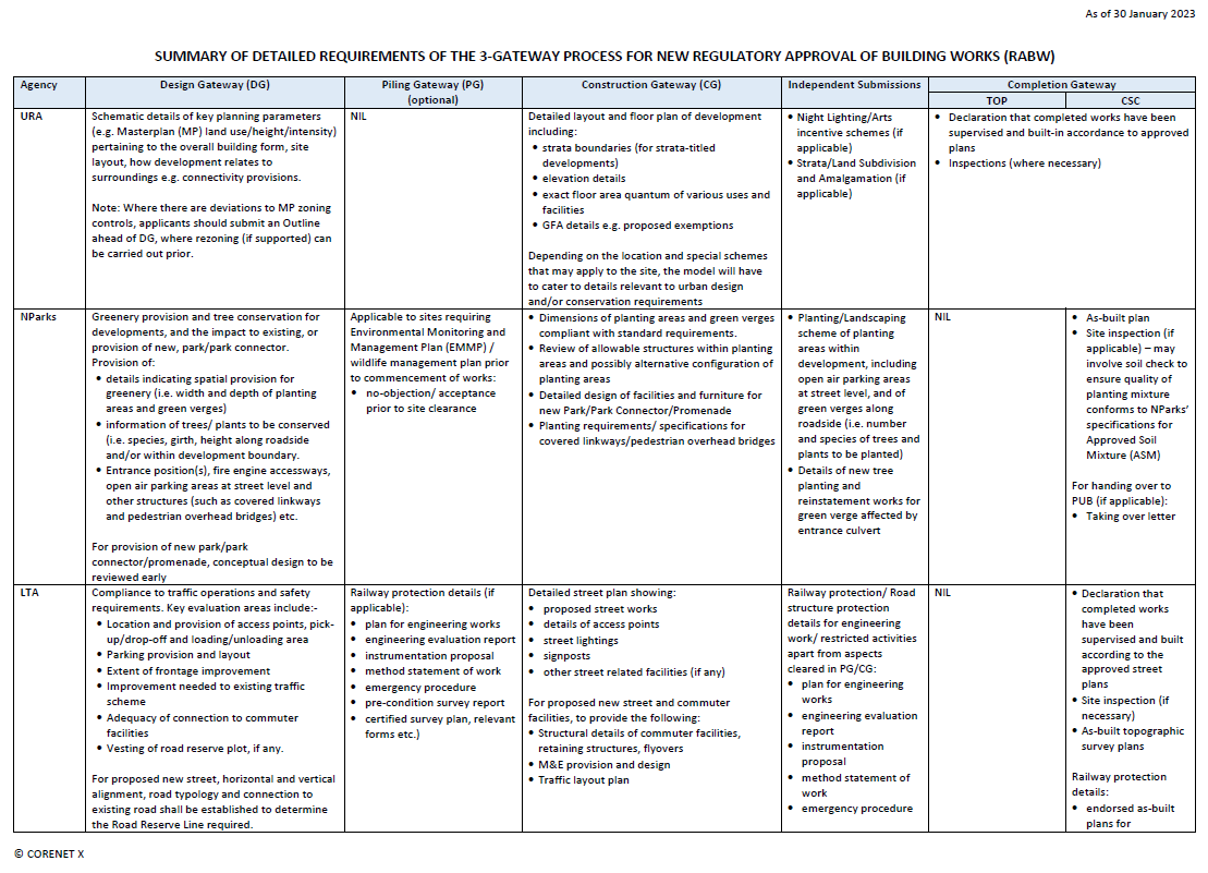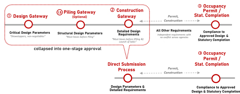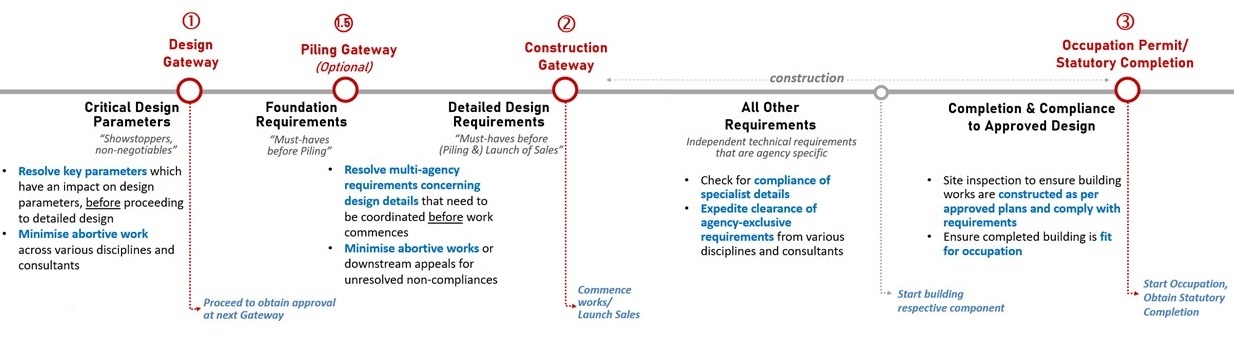 | Construction Gateway | To resolve multi-agency requirements concerning detailed building design (e.g. layout, accessible route, fire escape route, etc.) that need to be coordinated before commencement of works and launch of sales. Project teams are only allowed to commence works after obtaining the necessary Gateway clearances and permits. Note: For a typical project, submission at this stage will be a joint submission by the QP (Architect), QP (C&S Engineer) and QP (M&E Engineer), to clear the detailed design with regulatory agencies. |