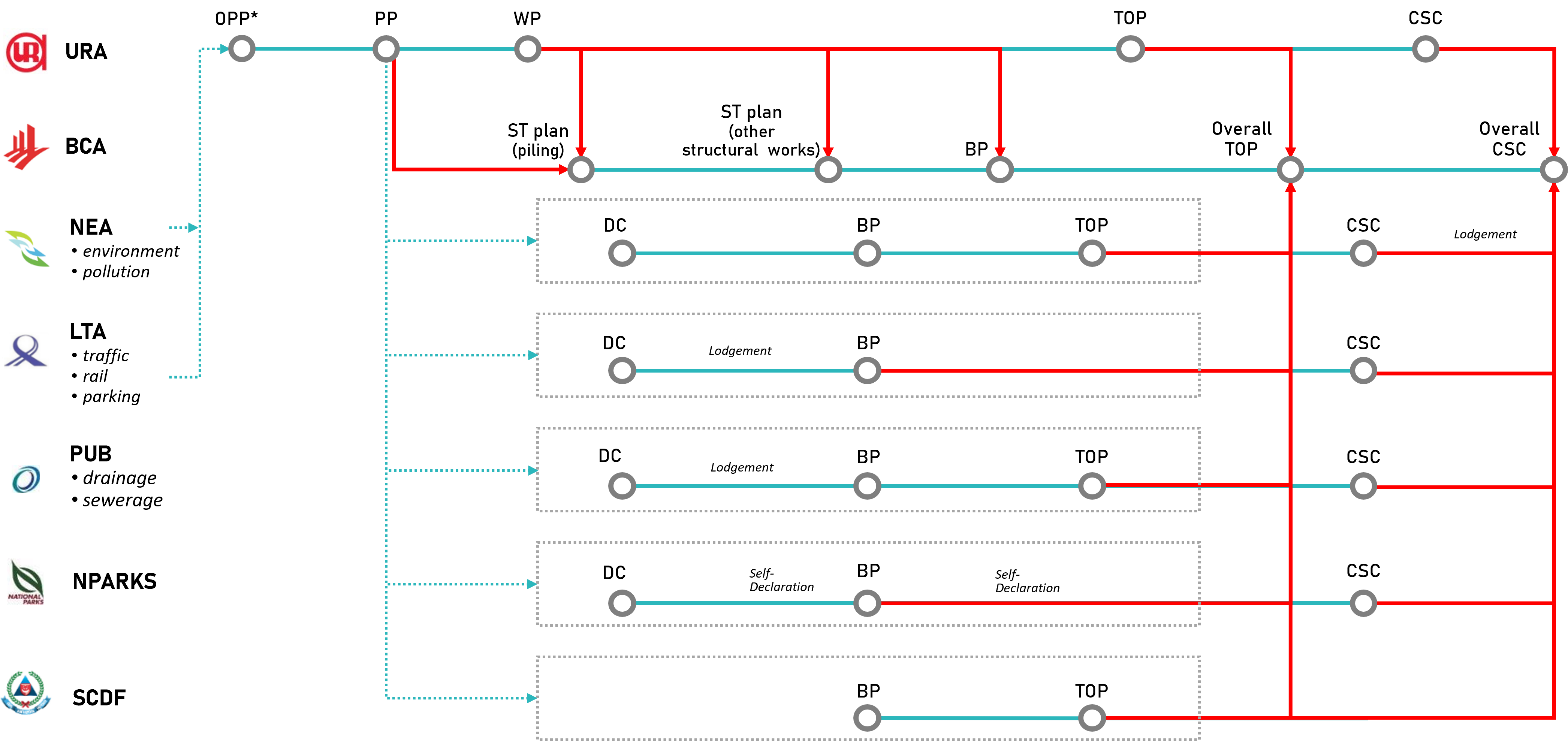 Building developments in Singapore are regulated by 8 key regulatory agencies: BCA, URA, LTA, NEA, NParks, PUB, SCDF and SLA for land and strata matters.