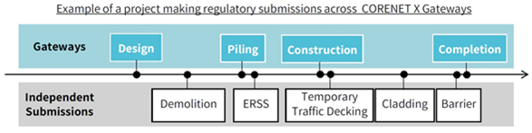 - Between the Construction and Completion Gateways, the individual professionals can submit the agency-specific technical details as independent submissions to the respective agencies via the same CORENET X submission portal.