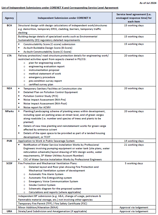 | Independent submissions (if applicable) | To clear agency-specific requirements of specific technical details or components that are regulated by a specific agency. These requirements can be submitted independently to the specific agency via the same CORENET X submission portal. (e.g. Structural submission of ancillary structures and components such as barriers/ claddings to BCA) |