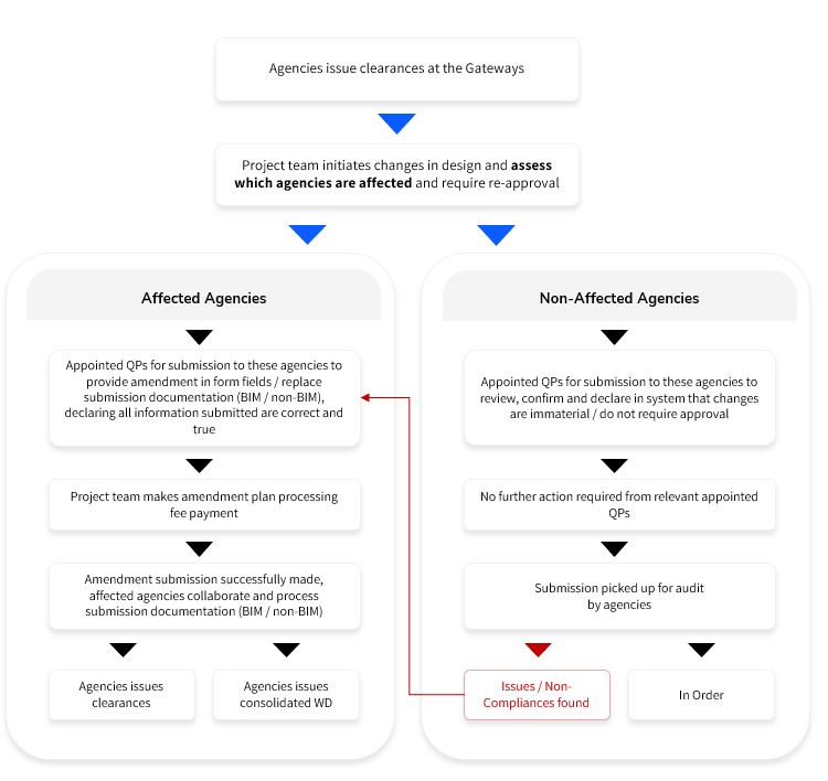 Design changes often occur during the design and construction phases. Depending on the extent of changes, amendment submissions may be required at the appropriate Gateways. Please refer to the following guide for more details on making an amendment plan submission on CORENET X.