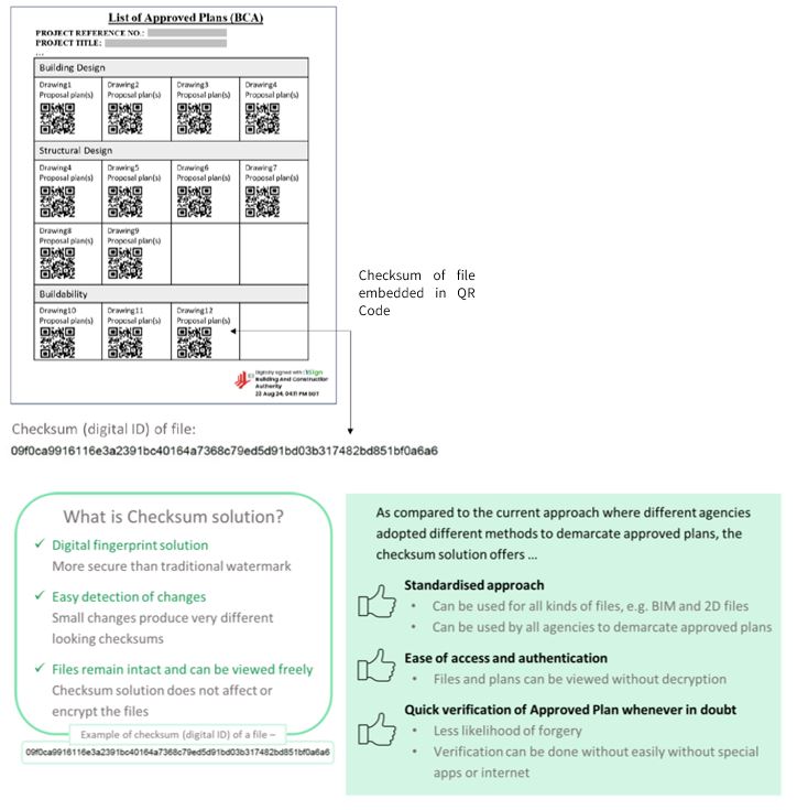 In the approval response, the QP will find a “List of Approved Plans” by each agency. The QR representation of the Approved Plan’s checksum will be listed in the “List of Approved Plans” (1 unique checksum per file).