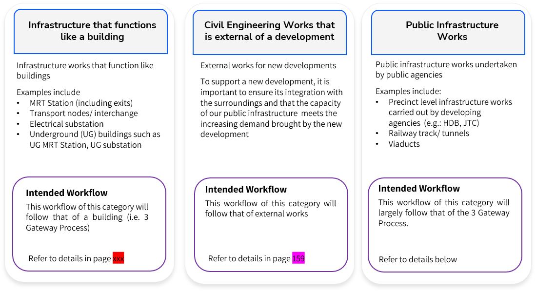 Other than building projects, our built environment involves infrastructure projects supporting the various needs for our population. While similar, infrastructure projects face different sets of challenges from building projects. This section aims to guide the industry through the regulatory approval for infrastructure works.